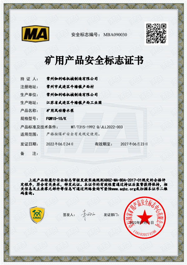• 礦用安全標志證書-FQW15-15/K